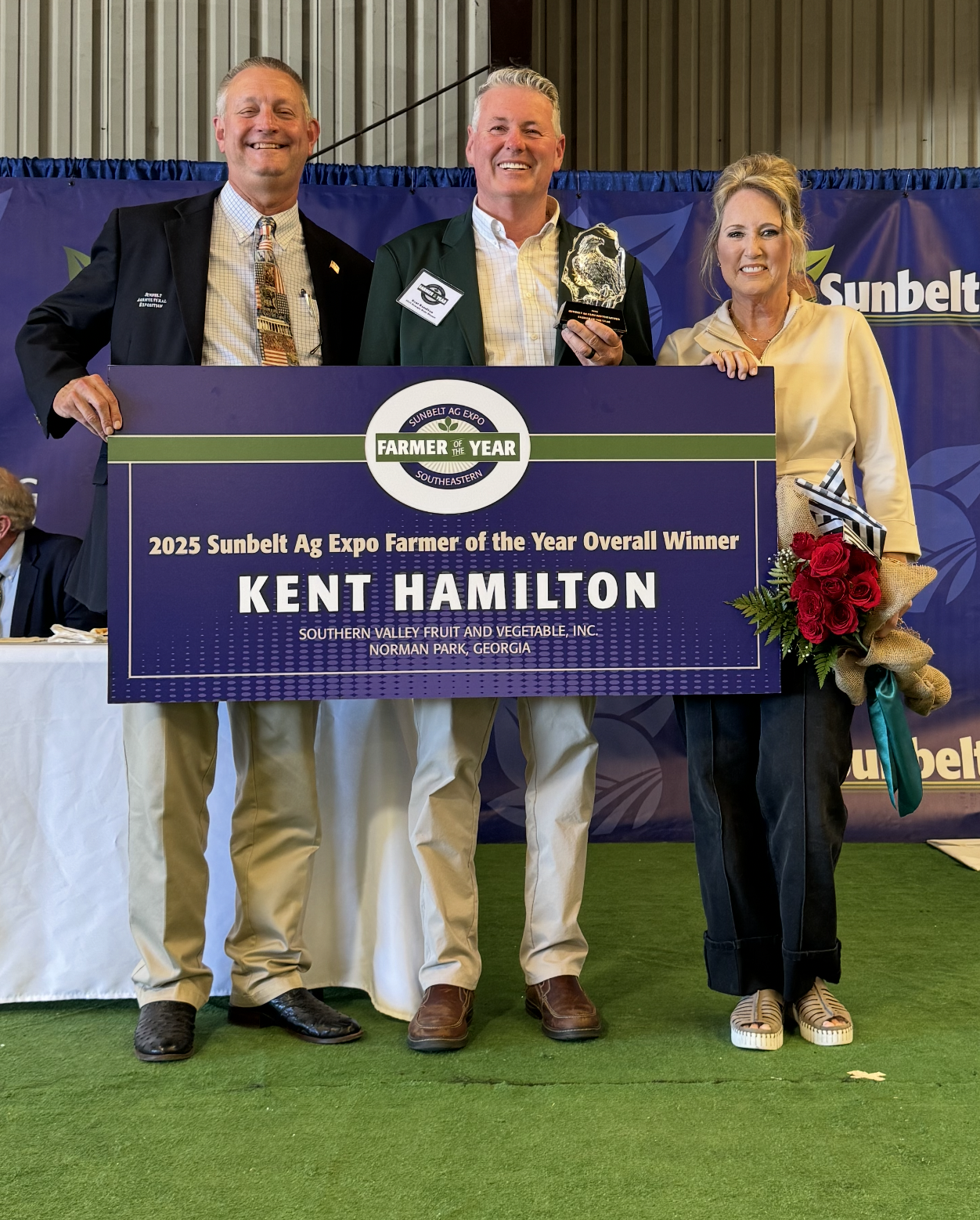 Exciting news! This afternoon at the Willie B. Withers Sunbelt Ag Expo Farmer of the Year Luncheon, the new Farmer of the Year was announced. Kent Hamilton of Southern Valley Fruit and Vegetable, Inc. in Norman Park, Ga., was named the 2025 Farmer of the Year. Hamilton’s wife joined him to celebrate his accomplishment.